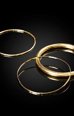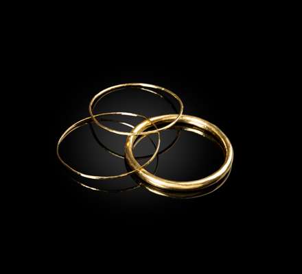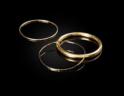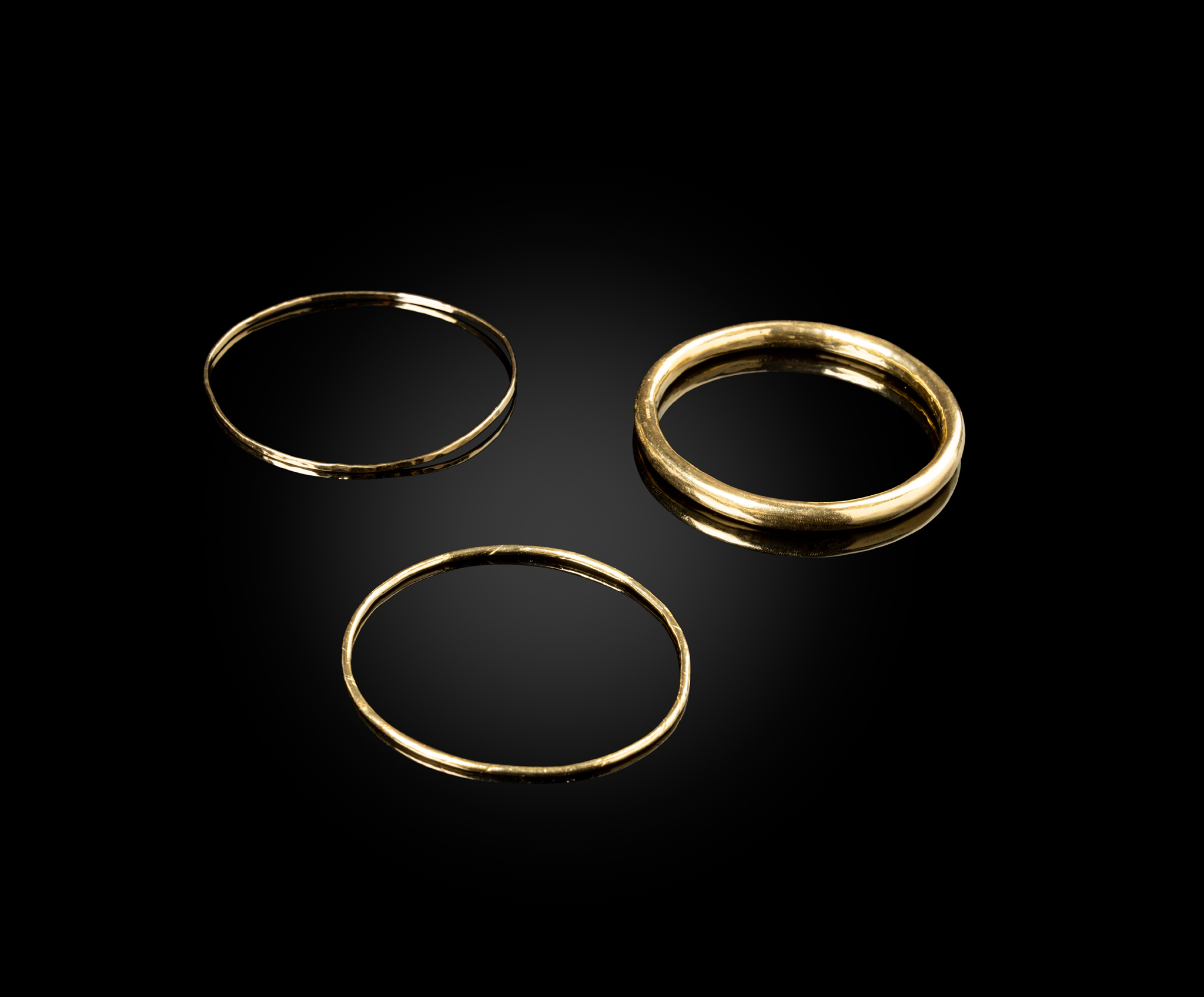 Inner width of thicker bangle: 5.8cm (2 ¼in); inner width of thinner bangles: 6cm (2 3/8in) (3), gross weight: 39.1 grams