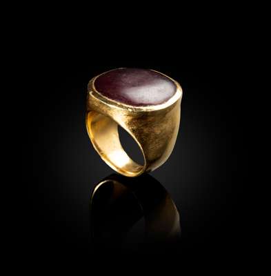 stamped maker's mark BOC, hallmarked for Birmingham 1971, 18ct gold set with oval dark red hard stone