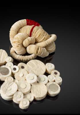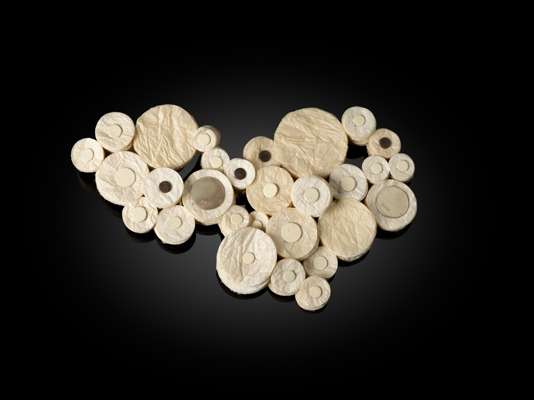 Celebrated Japanese artist Nakano Kaoru creates sculptural brooches from washi, the traditional handmade paper made from paper-mulberry fibres. Through folding, rolling and binding the paper into layered forms, she produces intricate, organic structures that are both lightweight and durable. Her work transforms a humble traditional material into striking contemporary jewellery that blurs the boundary between adornment and sculpture.