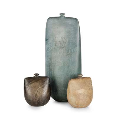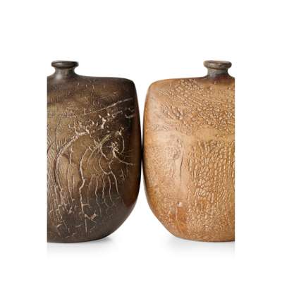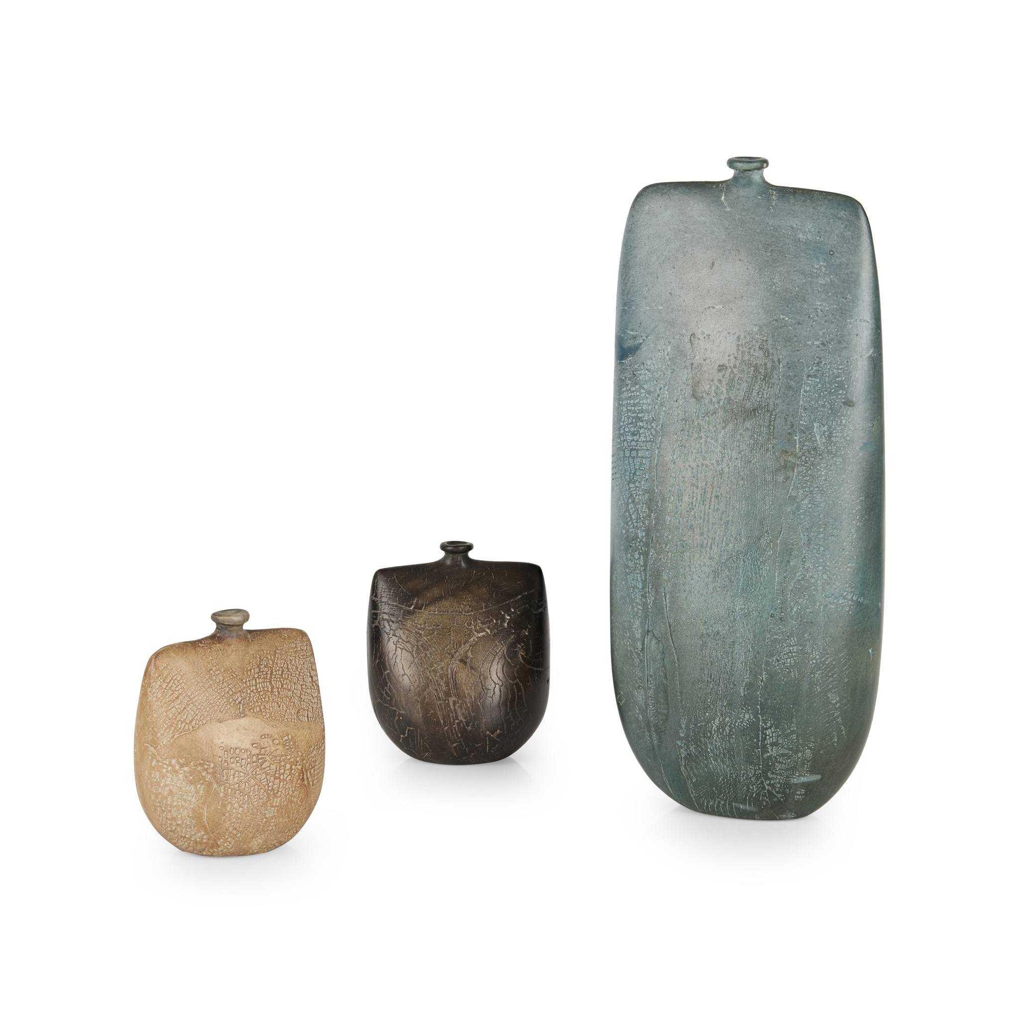 each with impressed maker's seal, the taller form and one smaller form signed and dated 1988 (to base), raku