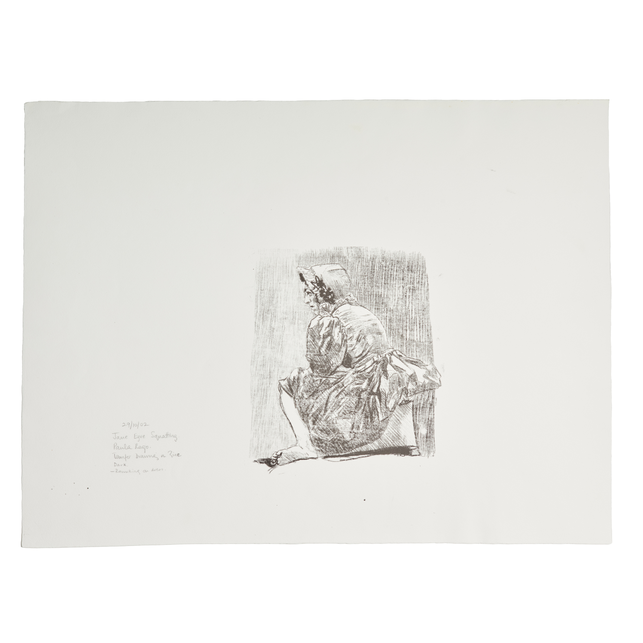 Transfer drawing on zinc, titled and dated 29/10/02 in pencil lower left, with further pencil annotations: ‘Paula Rego, Transfer drawing on Zinc, Dark - Re-working on dress’