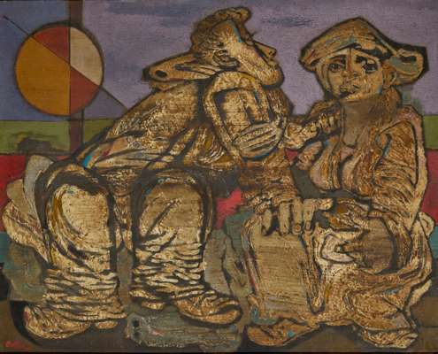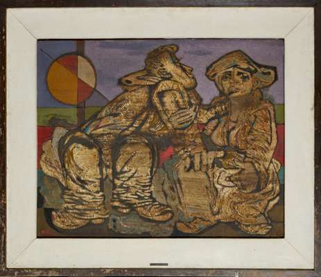 The Peasant and his Wife is an extraordinary bringing together of Adler’s profound compassion for mankind and his technical innovations. The monumentality of the figures is infused with the dignified emotion seen on their faces and expressed in the tenderness of their poses. The textured, layered technique is presented by way of a palette of muted earth tones, which is combined with the brilliantly coloured geometry of the setting. As Sarah Mac Dougall has pointed out, Adler’s work of this period reveals his assimilation of that of his Modernist contemporaries including Fernand Léger, Picasso and perhaps the Surrealists, realised within his own distinctive visual language.