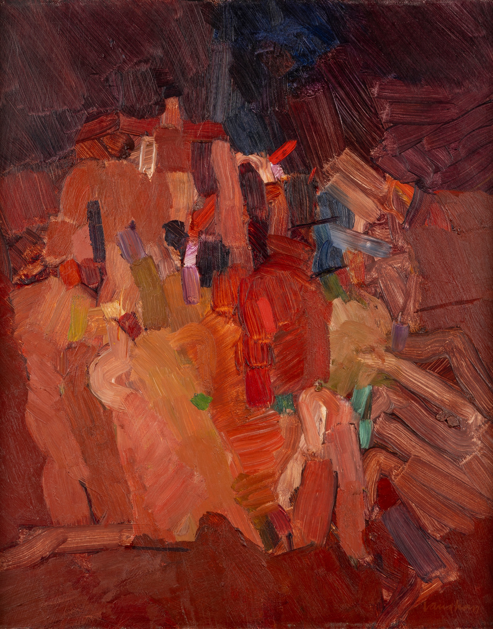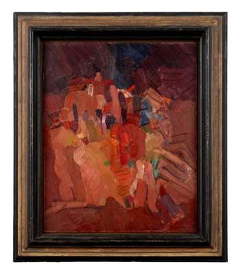 Study for Laocoön was one of a number of works that Vaughan created around the theme – itself the subject of one of the greatest sculptures if antiquity – which he exhibited as part of his solo exhibition at the Marlborough Gallery in London in 1963. It was around this time that Vaughan had also opened out his palette to encompass deep reds and oranges as counterpoints to his more usual dirty blues and greys and blacks. As work like Study for Laocoön, then, is both classic Vaughan, in conception and its concern with the male body and figural groups, but also quite rare, in its high key colour and particularly gestural brushwork.