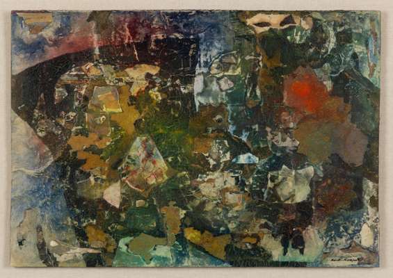 signed (lower right), mixed media and collage on cardboard