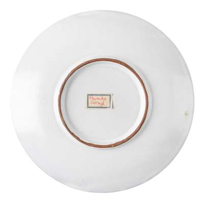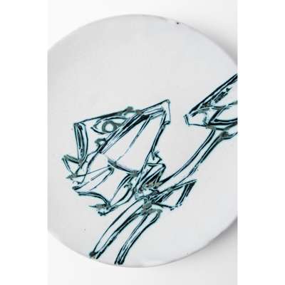 inscribed in red pen Prunella Clough on label (to reverse), glazed earthenware plate
