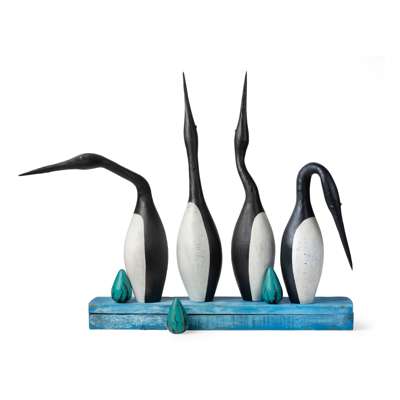 each bird signed and titled, painted found wood, with two differing bases