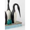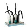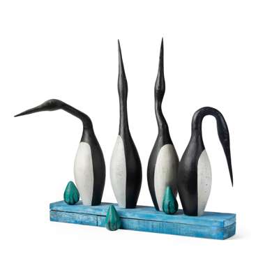 the tallest birds 76cm high (29 7/8in high), one base 9cm x 61cm x 38.5cm (3 1/2in x 24in x 15 1/4in), the other base 7.5cm x 85cm x 16.5cm (3in x 33 1/2in x 6 1/2in)