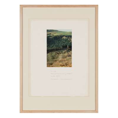 A MONTH OF RAIN / DEEP GREEN WET MOSS / UPROOTED BROKEN STACKS / LAST YEARS GROWTH / MOSS COLOUR IN THE SOFT LIGHT / OF A DULL GREY HEAVY SKY / ANDY GOLDSWORTHY / STONEWOOD/ 5 MARCH 1990, 18.5cm x 19cm (framed 72cm x 52cm);
