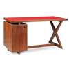 Stencilled DE07, teak, replaced red leather top, with cupboard to one side and drawers to the other
