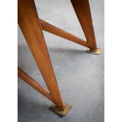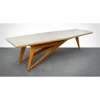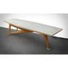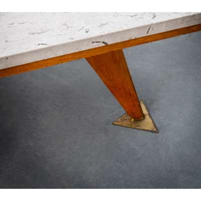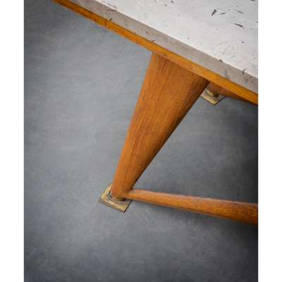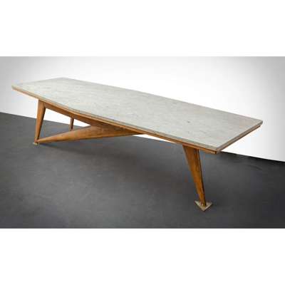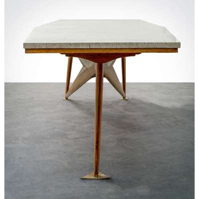 This extraordinary centre table is probably a one-off, and was presumably a custom-made design for a commercial office in the Turin area of Italy. It clearly references the anthropomorphic organic forms of the leading Northern Italian architects Carlo Mollino and Mario Federico Roggero, with a base designed to support the monumental marble top that creates a finished work of balanced forms, voids and dynamism. Although the designer of the current work is not identified, the highly crafted and sculptural nature of the work embodies the futuristic and aerodynamic creations of ground-breaking Italian design in the 1940s and 1950s.