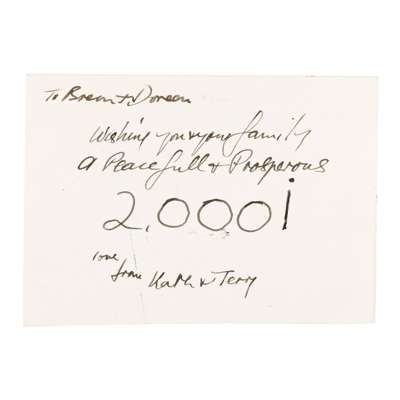 each inscribed in pen to Breon + Doreen [O'Casey] from Kath + Terry [Frost], and variously inscribed, one dated 1995 and one 2000, lithograph and gouache, collage and gouache and gouache on card