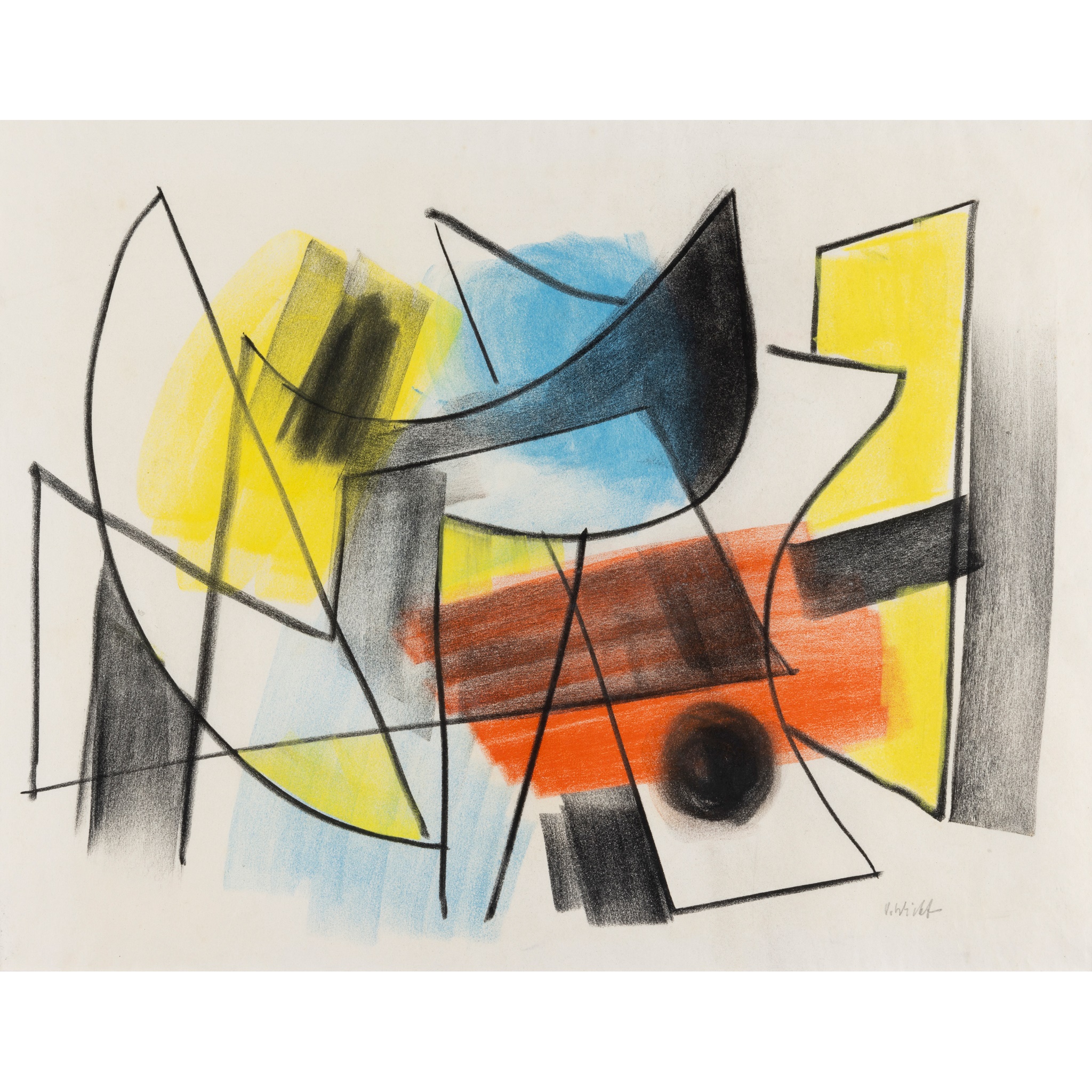 signed in pencil (lower right), ink and coloured crayons on paper