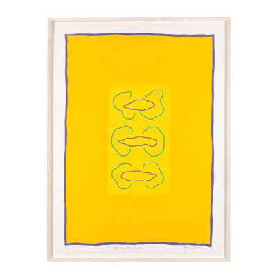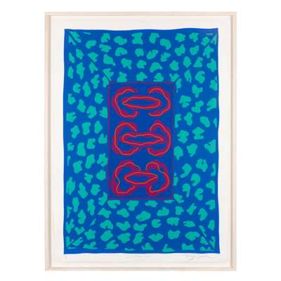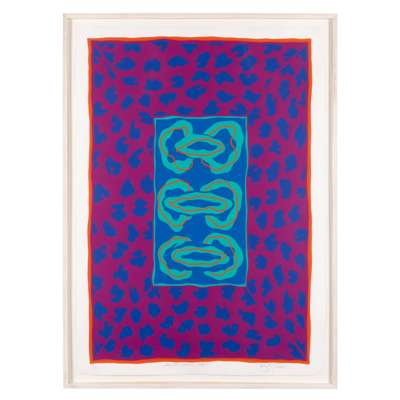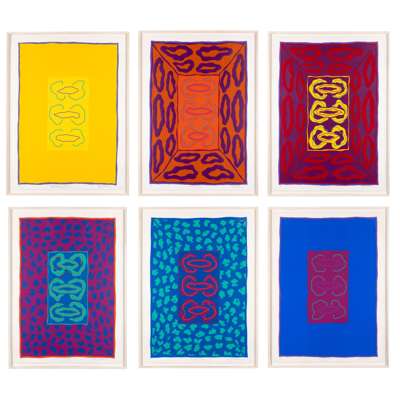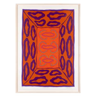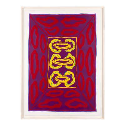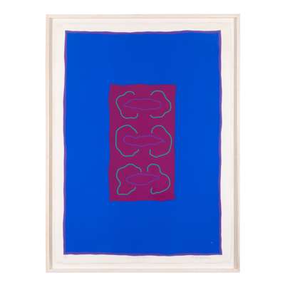It was during the 1970s, in collaboration with leading printer Kevin Harris at Calvert Studio, that Benjamin produced his seminal series of screenprints Roxy Bias Suite. Inspired by his student Brian Eno, Benjamin was fascinated by the new electronic music Eno was composing. Each of the six images in the series was named after computer music terms such as Inverse Echo and Multi-Mode Jitter. The screenprints use outrageously clashing bold colours, almost as if electrified and challenge the viewer with uncompromising energy. Sumptuous pieces, they were both of the time but also way-ahead of their time.