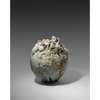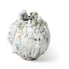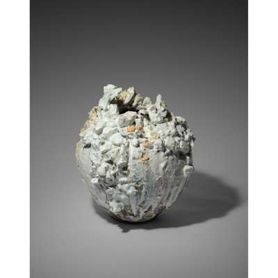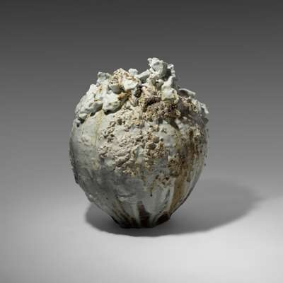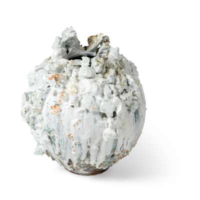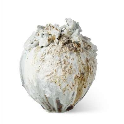 stoneware with rugged and cracked porcelain deposits over slips beneath running ash glazes