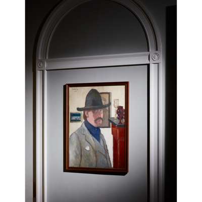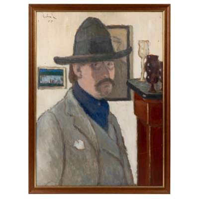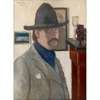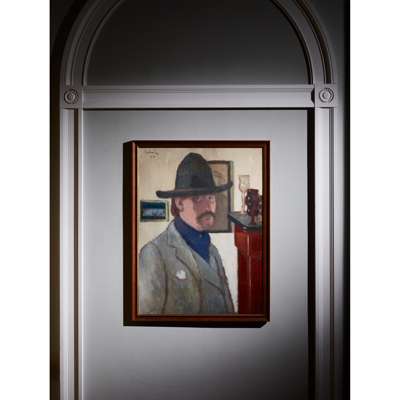 Rippl-Rónai returned to Hungary in 1902 and the current work dates from this early period back in his homeland, but continues to bear the impression of the Nabis, with a gentle intimacy and a fondness for decoration. Possibly a self-portrait, the painting is dated to 1905 and communicates his interest in materials and clothing. He believed that not only was the artist’s full body of work of importance, but also his public persona and mode of living, including the way he dressed. Rippl-Rónai’s Post-Impressionist tendencies, including his use of two-dimensional representation and contouring, continues with this portrait, as well as his playful use of a painting within a painting motif, a technique that can be seen in a number of his important works.
