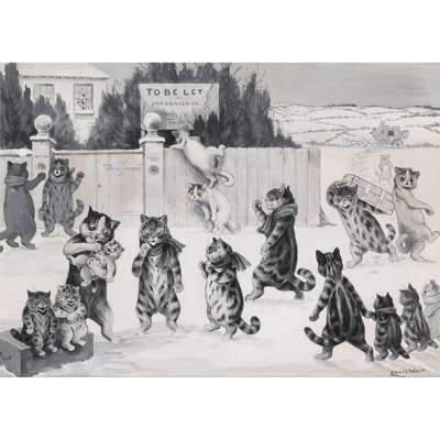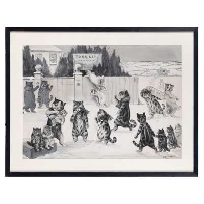 The works offered here are from the peak of this unique artist’s career and are amongst some of the finest examples to have appeared on the market for some years. Hockey, c.1904, depicts a ferociously competitive cat hockey match with the viewer plunged into the thick of the action. It is one of Wain’s most recognisable and popular images, having been one of the widest published postcards of 1904-05. To Be Let Unfurnished is another fantastic example of Wain’s talent as a world builder: each cat has a sense of its own character, its individual plotline unfolding. The attention to detail is so involved, the characterisation so well observed, that it is easy to see why the nation took Wain’s imagery to their hearts and why his cause was taken up so generously when news of his sad fate reached society’s ears. Both works have been in the same family collection since at least as early as 1915 and it is with great pleasure that Lyon & Turnbull presents them to the market now, having been unseen by the general public for over 100 years.