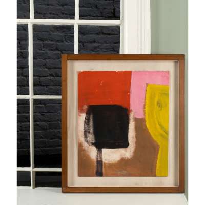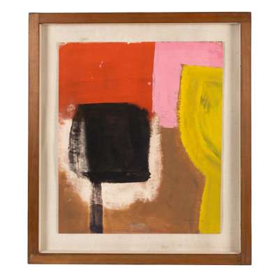 To cope during this period of loss and upheaval in her life, Barns-Graham became absorbed in psychoanalytic, philosophical and spiritual theory, working throughout the 1960s on a series titled ‘Order and Disorder of Things of a Kind’. As in the work offered here, we see this manifesting in the exploration of how colours and forms interact and react in relation to one another; the compositions radically simple. This work reads like a study or experimental exercise, in which she tests the vibrations provoked by the juxtaposition of contrasting, often jarring, colours. The black form forces its way forward, seeming to emerge from the wispy stroke of white which our eyes travel over next, before the vivid synthetic pop of pink jostles the curvaceous chartreuse shape towards us, which in turn seems to tilt precariously off to the right of the frame.