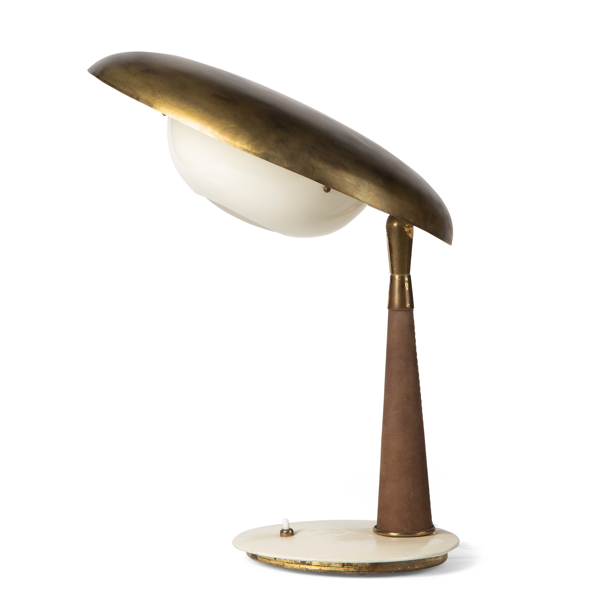 brass, enameled aluminum, leather, frosted glass
