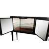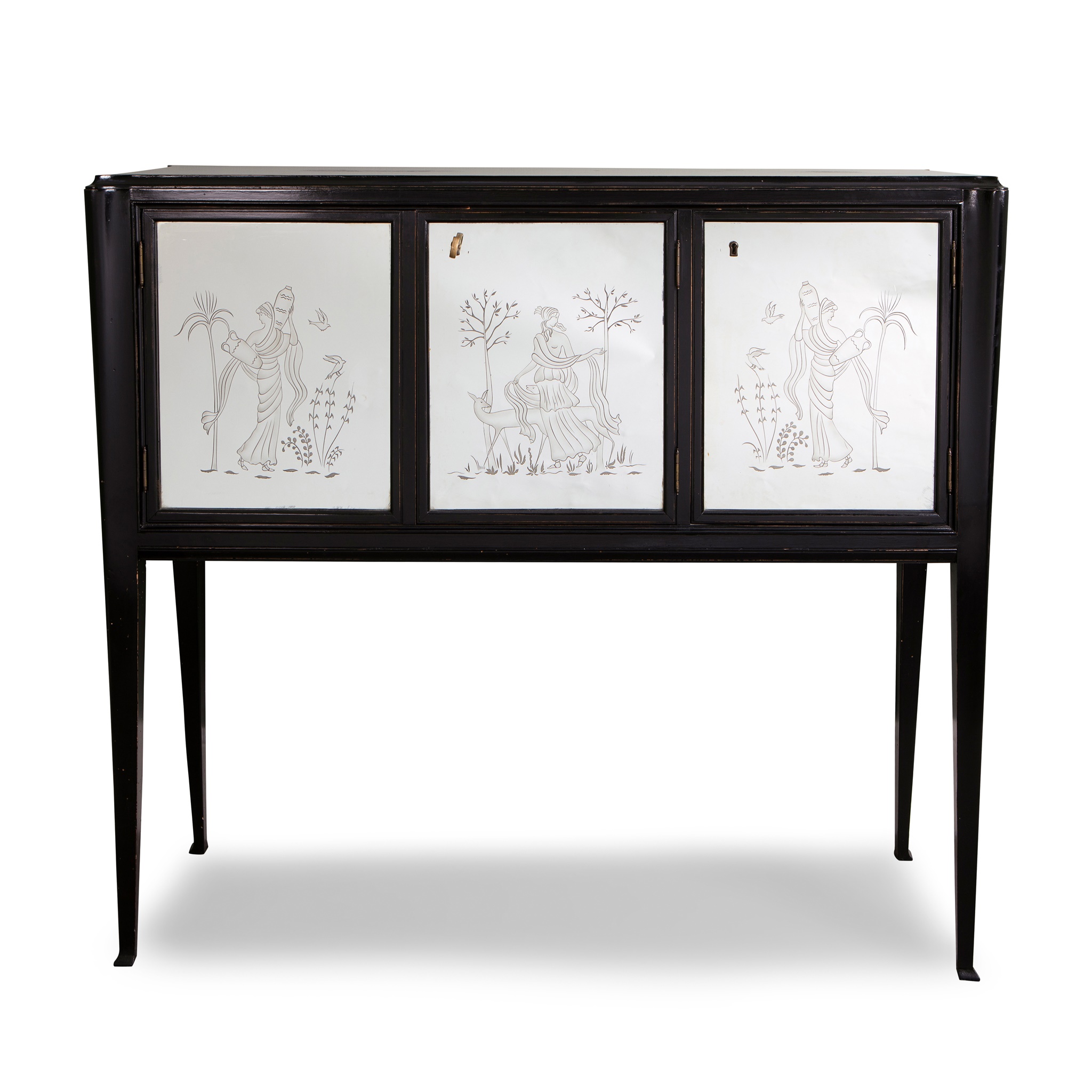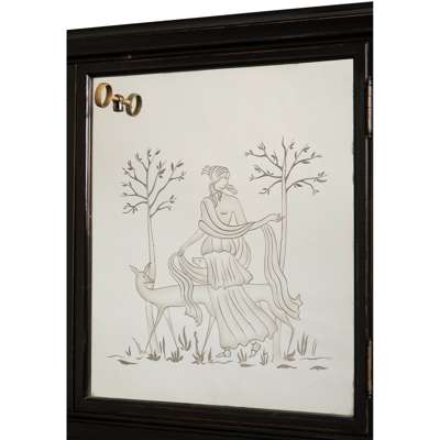 ebonised wood, mirrored glass and brass, the mirrored doors decorated with Grecian ladies, amongst trees, birds and a deer, opening to reveal mirrored panels, glass shelves and overhead lights, all on shaped legs