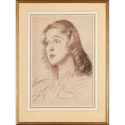 The style of this portrait drawing is instantly recognisable as belonging to the 1940s, when Augustus John's fame was such that many people wanted to sit for him. Rather than using oil paint, he used red and black chalks, with white chalk for highlights, a medium that he had not used since the first decade of the 20th Century. Many portraits were executed in this way, and as in the present work, his female sitters sat for him wearing classic 1940s hairstyles, and were not always named. Comparable works are reproduced in ‘Augustus John: 52 Drawings’ (George Rainbird, 1957), in which the artist insisted that a selection of his recent portrait drawings should be included.