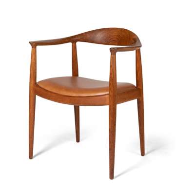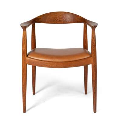 model no. JH503, stamped 'Johannes Hansen / Copenhagen / Denmark', and manufacturer's logo, oak with tan leather seat