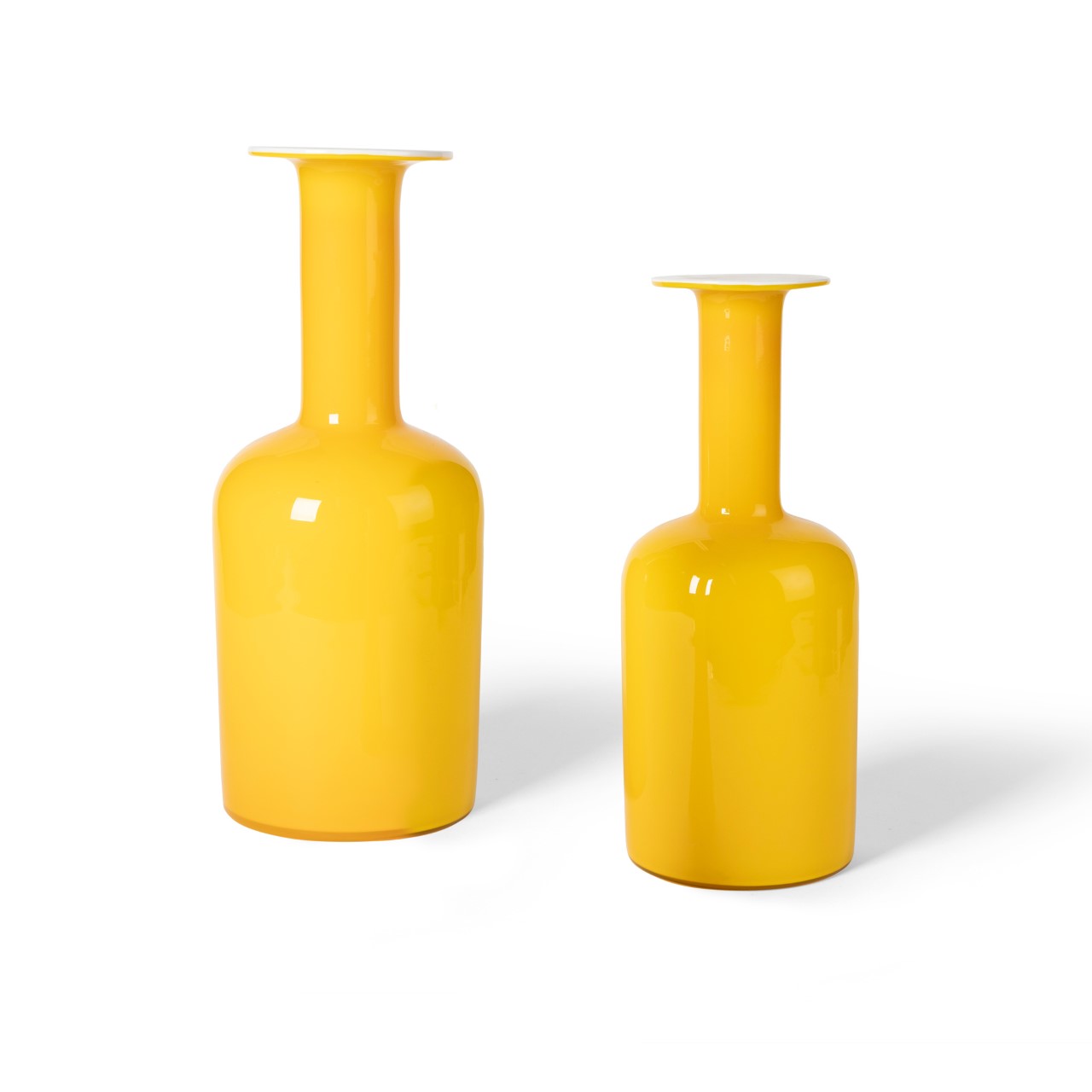 glass, in yellow colourway, one of large form, the smaller example with 'Holmegaard' paper label