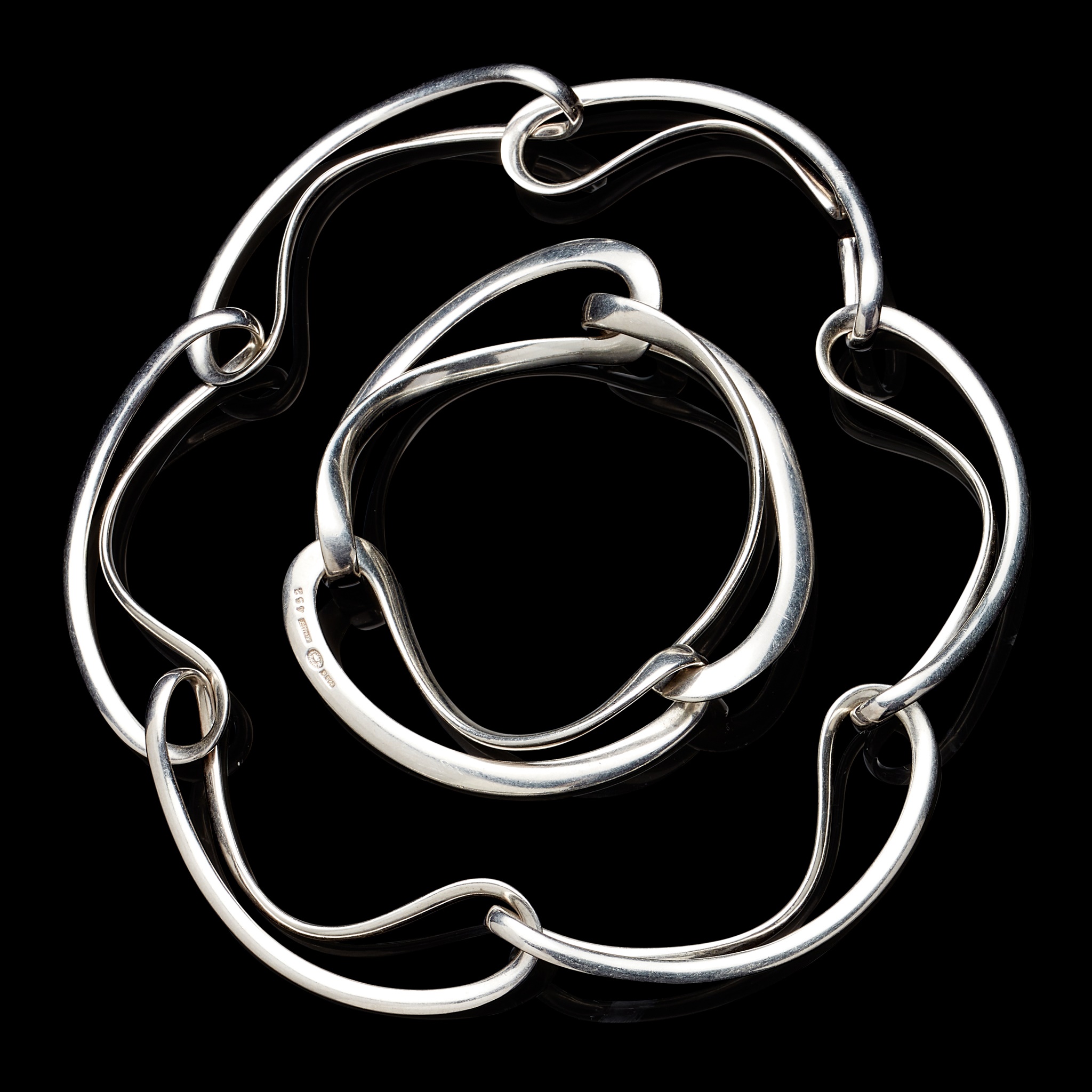 bracelet marked '925 S / GEORG JENSEN / DENMARK / 452', the necklace marked 'GJ / 925S / 452 / M', both composed of bold curving links