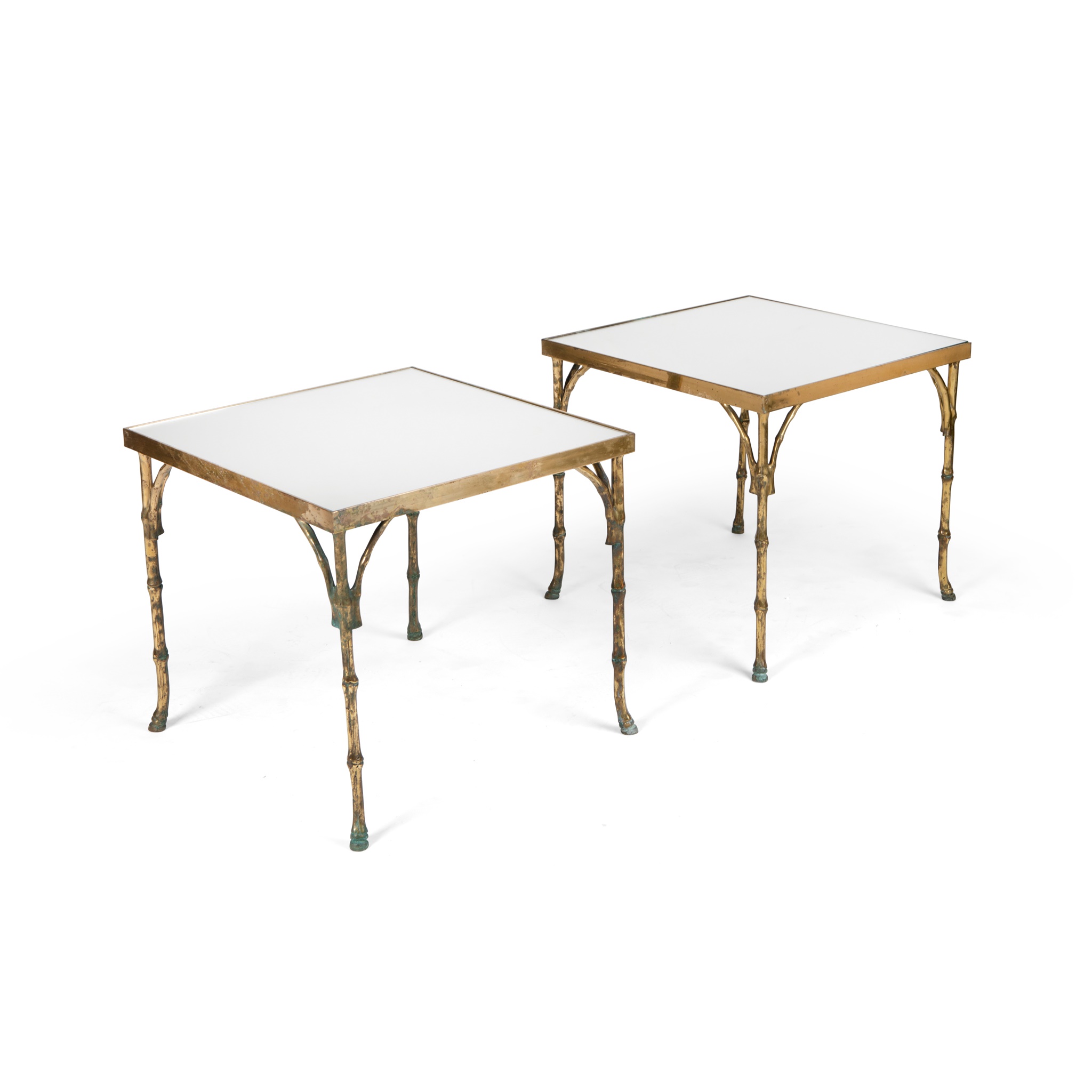 mirrored glass tops, framed and supported in gilt metal, possibly bronze, cast to simulate bamboo, and horse hoof feet
