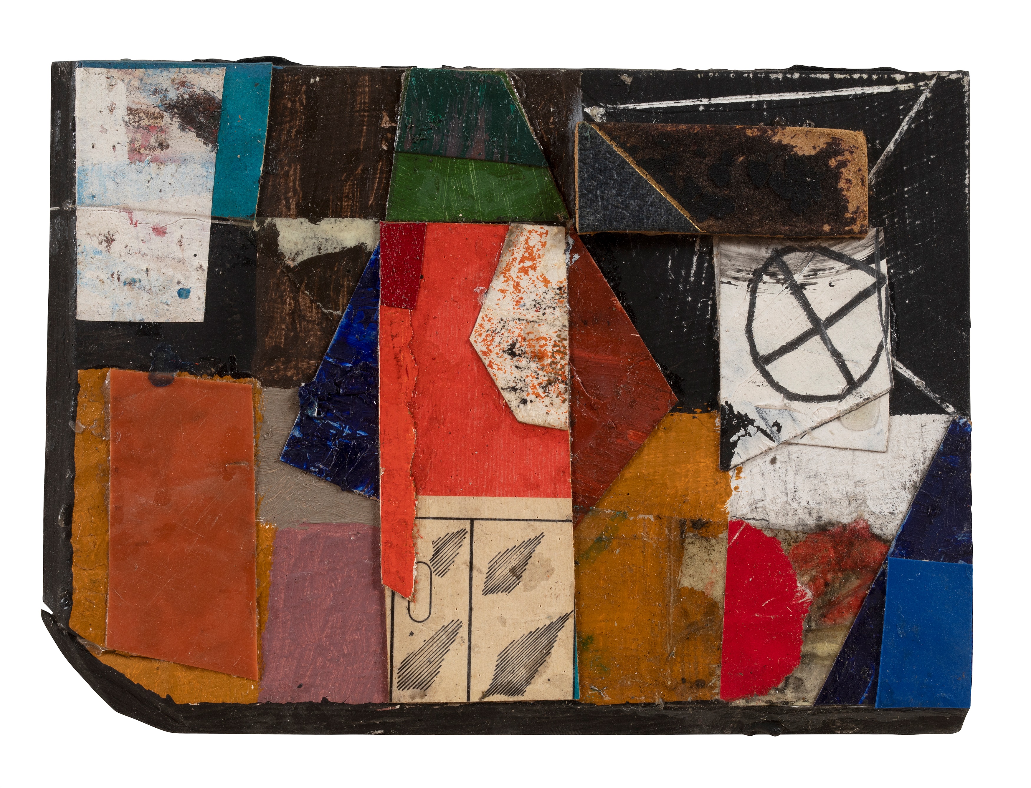 with studio stamp (on the backboard), pencil, oil and collage on shaped board