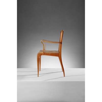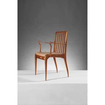 Sir Basil Spence was one of the leading British architects of the 20th century, whose monumental or 'brutalist' style came to define modern architecture in Britain. Noted commissions include designs for several exhibitions including the Sea and Ships Pavilion for the Festival of Britain (1951), Sussex University (1962), Glasgow Airport (1966), and Coventry Cathedral (1954-1962), for which he received a knighthood. In 1947 Neil Morris of manufacturers Morris of Glasgow asked Spence to collaborate on a range of plywood furniture he was working on, which was to include his Bambi chair and celebrated Cloud table. The result was the Allegro dining suite, which was awarded a diploma by the Council of Industrial Design in January 1949. In March of the same year it was exhibited at the Glasgow Today and Tomorrow, where it was commended, and an example of the armchair was commissioned by the Museum of Modern Art, New York for their collection. In September 1949 it was displayed at the Morris stand, also designed by Spence, at the Scottish Industries Exhibition. In 1951 another single armchair was commissioned for the collection of the Victoria & Albert Museum in London (V&A CIRC.183-1951).