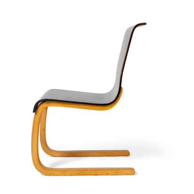 model 21, 1930s faded 'Finmar' label, stamped '28' (to base), bent laminated birch and molded plywood