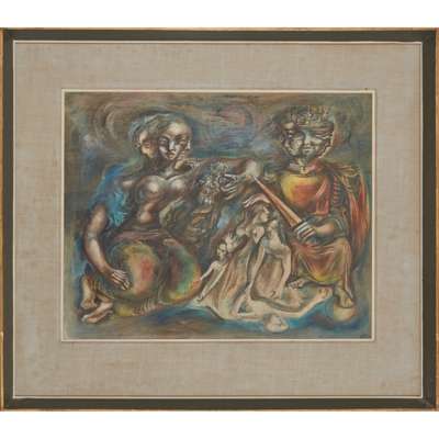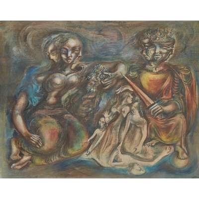 Leslie Hurry produced a series of fantastic ink drawings during the early 1940s, based on imaginary kings, queens and altarpieces, which were headed with a long poetic text and bound together to form a private book entitled The Journey for Grace Sholto Douglas. The current work displays an equal degree of Blakean doom-laden symbolism, and is part of the revival of a British neo-Romantic movement in the years directly after the Second World War.