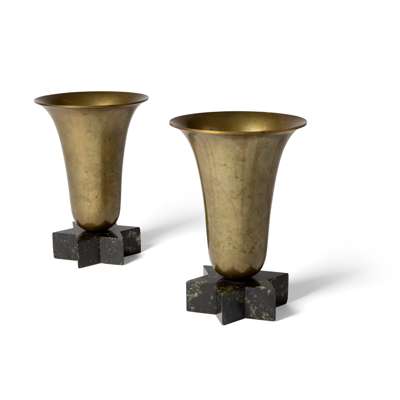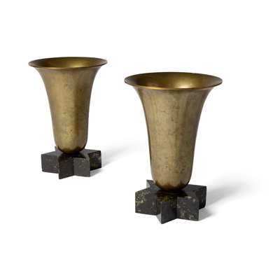 engraved signature 'EBoiceau' to each vase, bronze on star shaped porphyrite bases