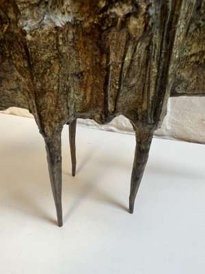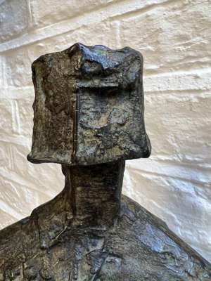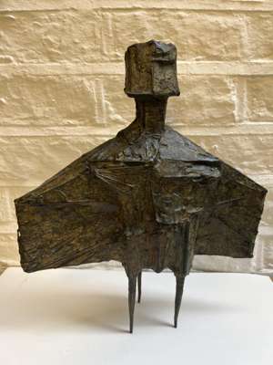 In Maquette for Stranger, the power of the anonymous figure’s torso and spread-out winged arms is contradicted by its tapering, spindly legs. It has a monumentality and stillness which yet suggests strength in movement. As Bowness continued ‘the Strangers and Watchers seem to be tensed: waiting, aware that something is going to happen…the tensions arise directly from the sculptor’s treatment of surface. His technique leads him to build an armature, constructed from straight rods, and this becomes the skin as well as the bone of the figure. Everything is thus brought on to the surface, and the network of rigid lines and absence of curves is somehow expressive of a high pitch of nervous intensity, possessed by these strange immobile creatures.’ (Bowness, op.cit., unpaginated).