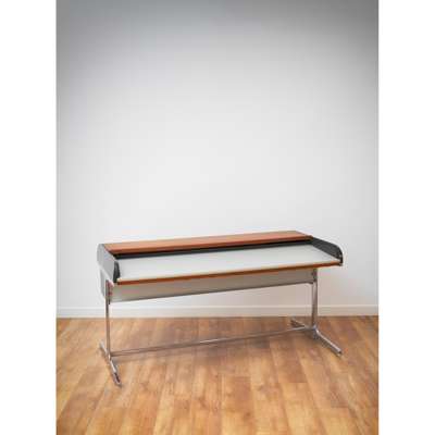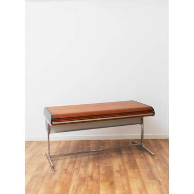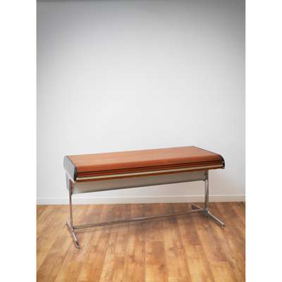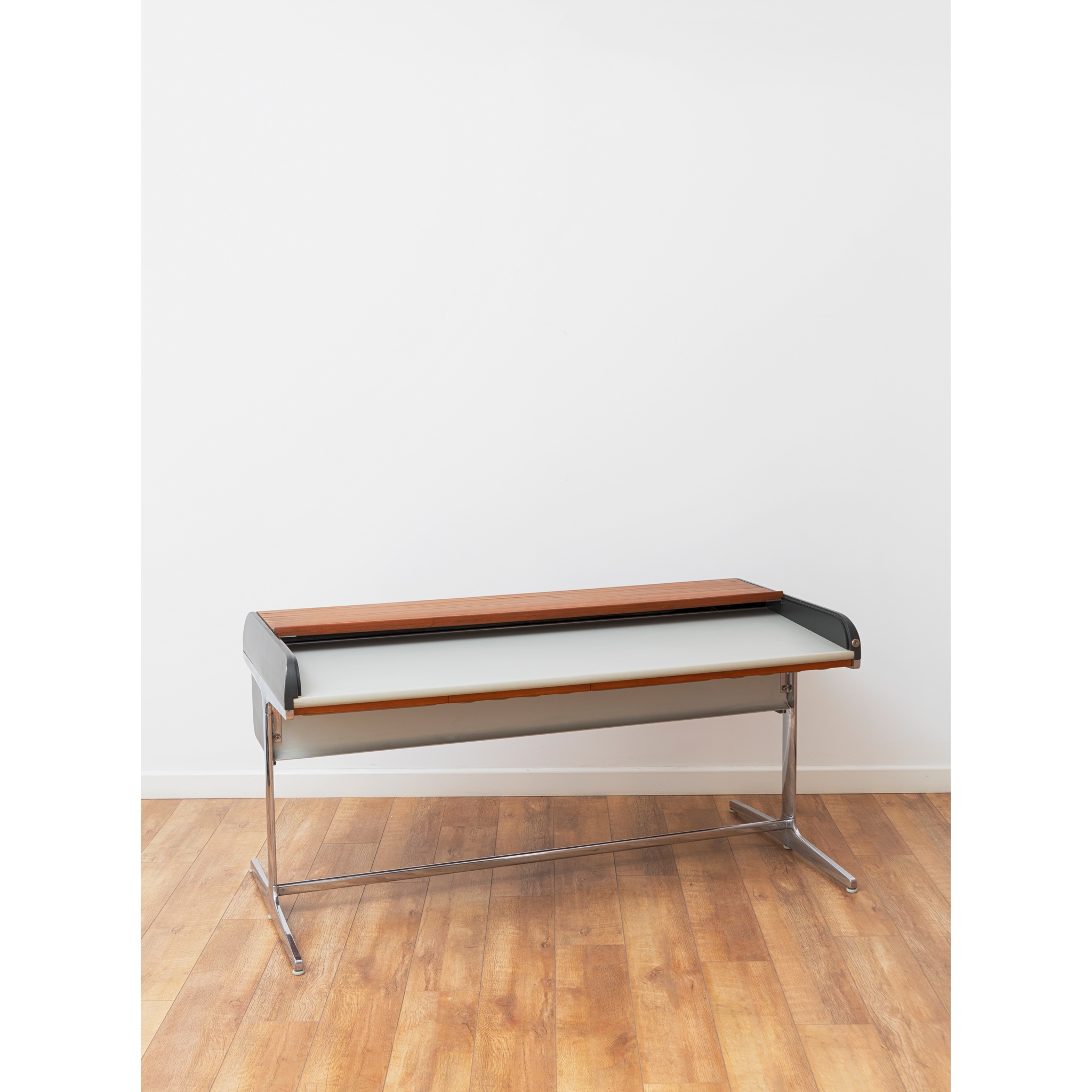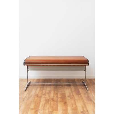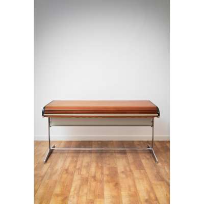laminate, chrome-plated steel, rubber, plastic, the desk features two drawers and a tambour door concealing storage