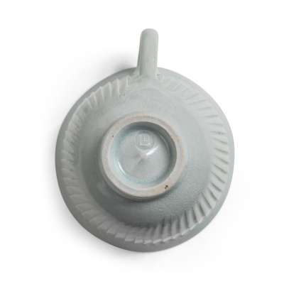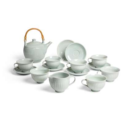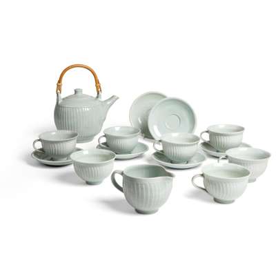 impressed artist's seal, porcelain, celadon glaze and fluted decoration, comprising teapot, milk jug, sugar bowl and six tea cups and saucers
