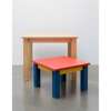 The construction of the corners is always the same, as a table can be made to order by simply giving the size of the table top and the height. It can be plain wood, sealed, or stained white, black and primary colours, on their own or a combination – red, yellow and blue.