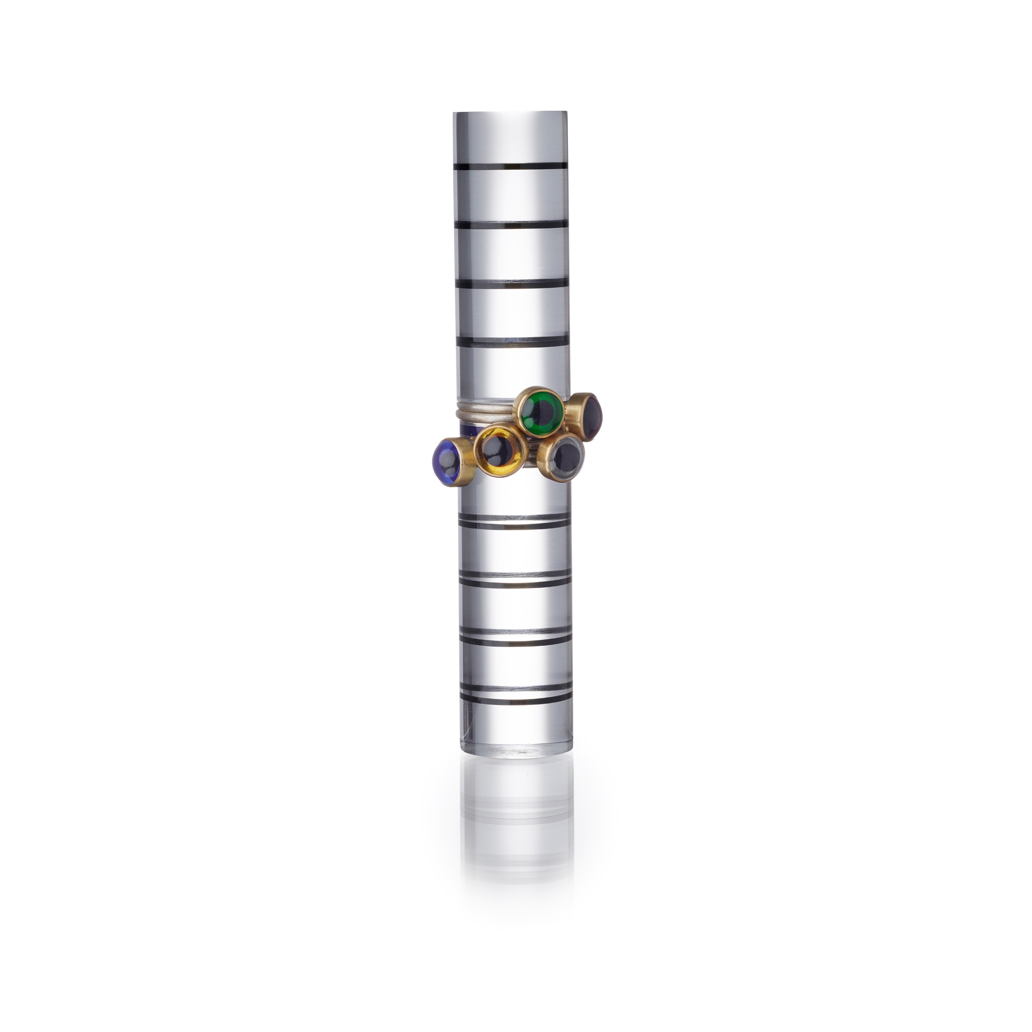 Silver metal, yellow metal, glass, enamel, on acrylic stand with black bands, the enamelled band hallmarked for London, 1985