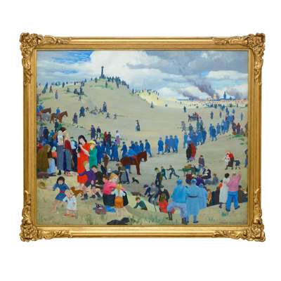 Seen from the point of view of the fleeing civilians whom Procter was in the region to aid, he depicts the nearby dunes strewn with refugees and members of the military, streaming away from the city which burns in the background. The towers of the church of Saint Éloi and the town hall are visible in the skyline – of which an annotated sketch is in the Imperial War Museum’s archive (War Artist Archive: Ernest Procter, ART/WA1/298, 'Belgium misc’ portfolio). The image is full of sensitively observed human relationships, between adults and children of all ages, interspersed with animals. Children play whilst grown-ups survey the scene before them, overlooked by a cross on a dune to the upper left, which may refer to Christ’s crucifixion at Calvary. Sunshine and shadow are captured over the flow of the dunes, whilst a use of bold colour, including red, green, pink and orange, attracts the eye throughout the complex composition.