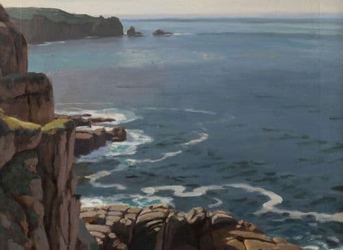 Clifftop View, Land’s End is a beautiful example of the images Knight painted of the Cornish coast, in this case the most westerly part of mainland England. Knight’s high viewpoint does full justice to the dramatic granite cliffs, leading the eye from the detailed foreground to the high horizon in the distance. Waves follow the contours of invisible coves and bays on which bright sunshine and dense shadow play. Knight’s excellent draughtsmanship and sensitivity to colour and tone is clear. It bears witness to the declaration in a 1921 article in The Studio about Harold and Laura Knight’s work that the former ‘has devoted himself to the study of the effect of daylight, both in the open and indoors and he has mastered the difficulties created by the subtle variations of tone and colour due to the pervading light. This enables him to introduce into his pictures delicate and beautiful tone-gradations without sacrificing the brilliancy and freshness of his colour-schemes.’ (Ernest G. Halton, ‘Foreword’, Modern Paintings Number One: The Work of Laura and Harold Knight, The Studio Ltd, London, 1921, p. 5).