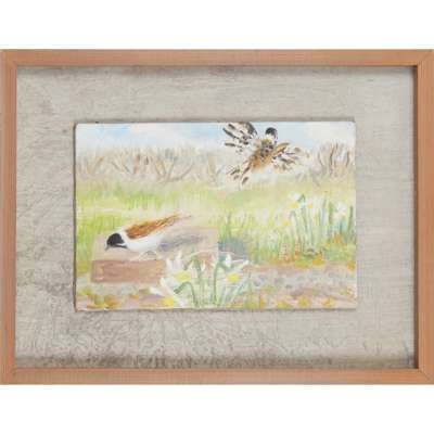 Winifred Nicholson took a delight in birds, particularly those in flight as seen in this intimate work. Deftly painted, the birds are observed in the midst of daffodils, pecking at the ground and at the point of flying away.