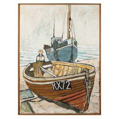 The current work was probably painted around 1965 when Bratby was in Dungeness, on the Kent Coast. It depicts the artist's son David standing behind the fishing boat 'RX72'