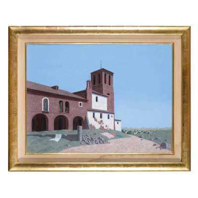 Hillier’s Post-war canvases evidence maturation towards a starker, franker style suffused with a sense of stillness and detachment. This view of a deserted Spanish monastery is painted with a characteristic precision and intensity bordering on photorealism, disrupted only by the nod to abstraction in the monochromatic blue of the sky. The legacy of surrealism can be identified in the cast-off clothes and towels which further the idea of desertion.