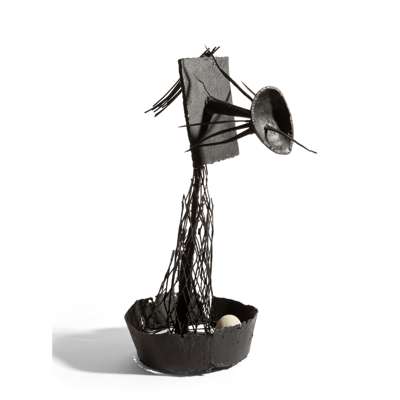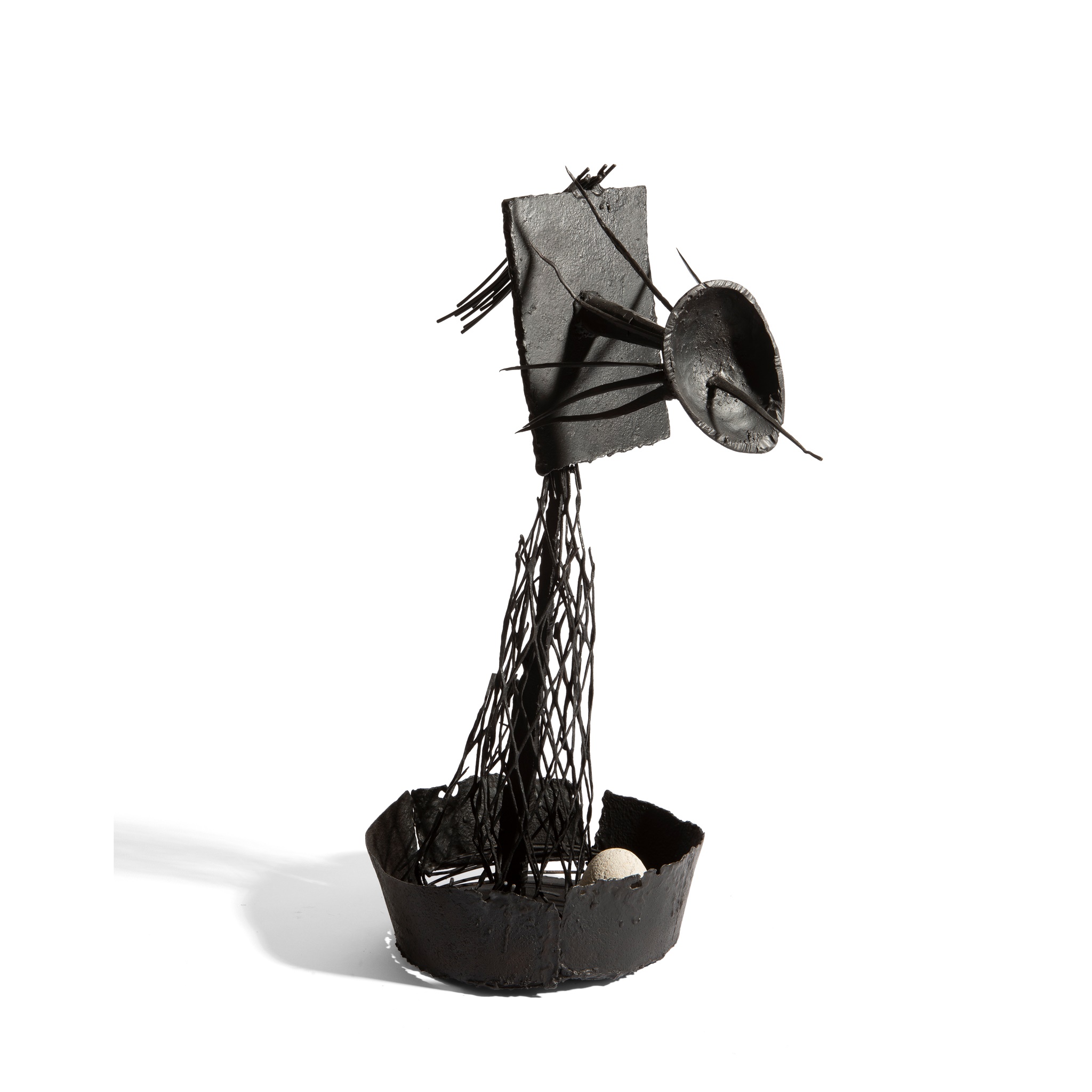For all the ‘Geometry of Fear’ artists, one theme seems to have been constant: that the human and the animal were interchangeable – that man had become a changeling being, easily becoming a beast. Equally, the ‘innocence’ of animals could also stand as a clear metaphor of our ability to wreak suffering on our fellow man. Clarke, Turnbull, Meadows, Chadwick and Paolozzi – perhaps more so than Adams, Butler or Armitage – all created bestiaries of creatures imbued with human emotion [which found equivalents, too, in the paintings of Francis Bacon and Graham Sutherland]. Bird One can be seen almost as the pendant to Clarke’s Complexities of Man (1951) now in the Tate. Both works resonate with human angst, but also with something deeper and more compelling. In Bird One, this is realised in the juxtaposition of the smooth, beautifully carved stone egg with the scored and rough surface of the nest and the spiky form of its protective parent, its head and beak striking out into space. The mass of the egg weights and centres the work, lending the initially terrifying form of the bird an underlying warmth and humanity, its primal scream turning to a song of motherhood.