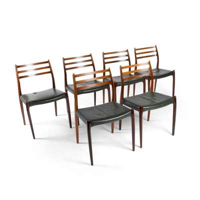 model no. 78, each branded with manufacturer's marks, rosewood and green leather, comprising six side chairs and two armchairs