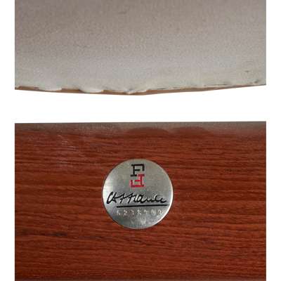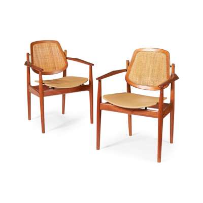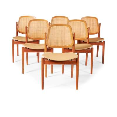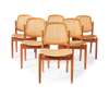 model no. 203, comprising two armchairs and six side chairs, teak, with vinyl seats and woven backs, each with maker's label