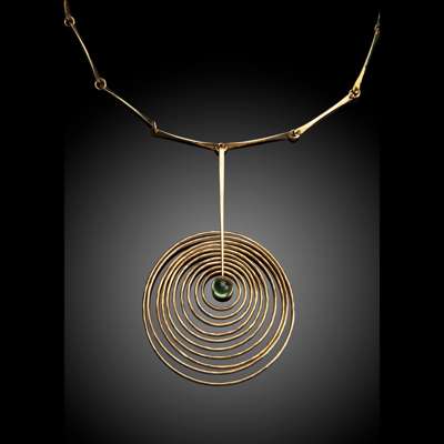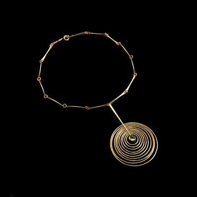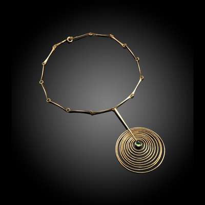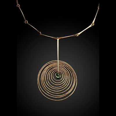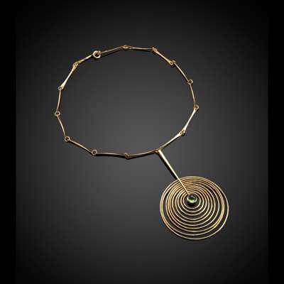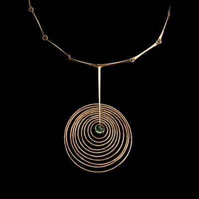 the pendant set with green cabochon stone, the pendant and chain each stamped 'BGP / 585 / DENMARK'