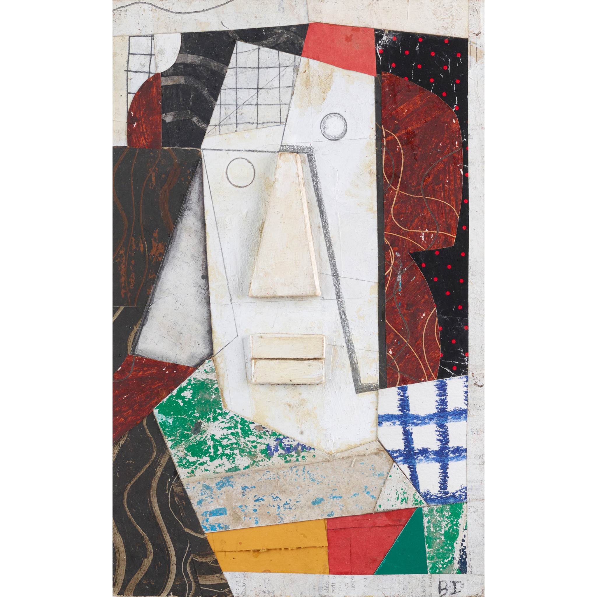 initialled in pencil (lower right), collage, oil, pencil and wood relief on board