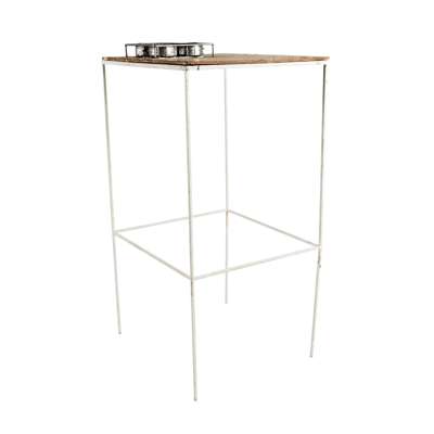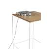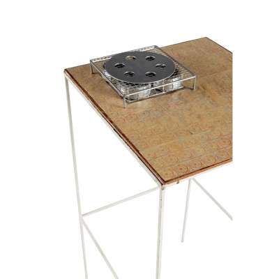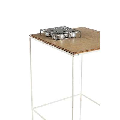 signed and inscribed 'enig A van A tot J. Panamarenko' (on a label affixed to the underside), printed paper laid down on wooden board, polyurethane G4, aluminium, metal, four flat coils and electric cable on a metal stand
