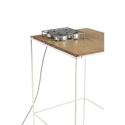 Champ Magnetique is part of a group of works that focuses on the kinetic force of a mechanical movement and magnetic forces, with the intention of animating the metallic disc, awaiting levitation, playing with ideas of spacecraft using electromagnetic energy. Panamarenko continued these ideas with a prototype for a seven metre in diameter flying saucer Bing of the Ferro Lusto X (1997). Designed to capture then recycle magnetic fluids, which in turn created sideways and upward movement, it offered the viewer the hypothetical knowledge of possible escape.